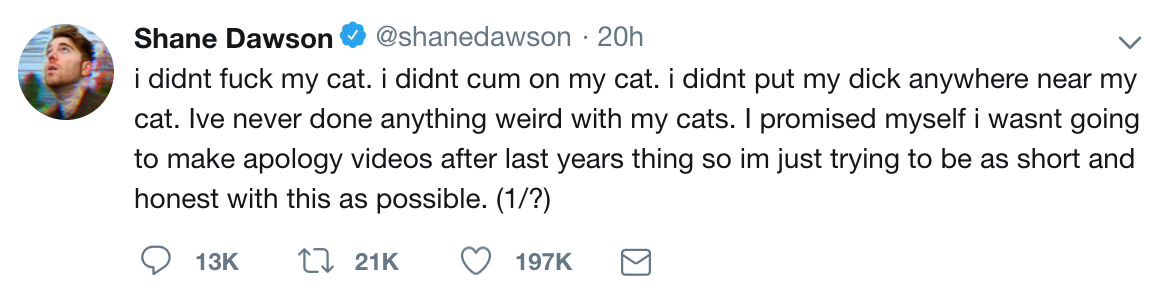 If Shane had ignored this in the first place nobody would be talking about it. He has a huge following on twitter but those people support him; by posting this thread it only spread like wildfire to people like me who see it and think it is the funniest, most absurd tweet that probably has some sort of truth to it. There are two routes to go in a situation like this: don’t acknowledge it and let it die quickly. Or say sorry and move it. Shane chose option 3 which was to spread this to every sect on twitter so people who have no clue who he is can make jokes about him fucking a cat. What a world.