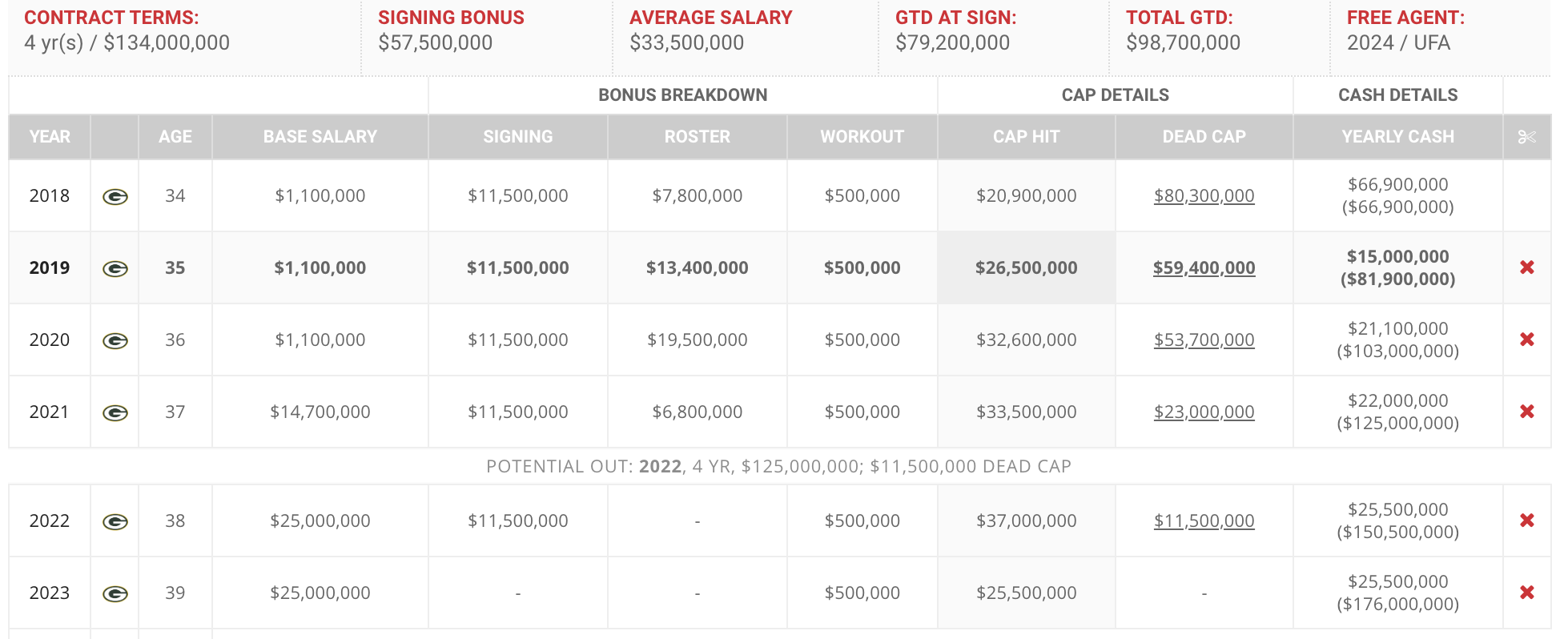 The two comparable contracts, Aaron Rodgers and Drew Brees, look like this: